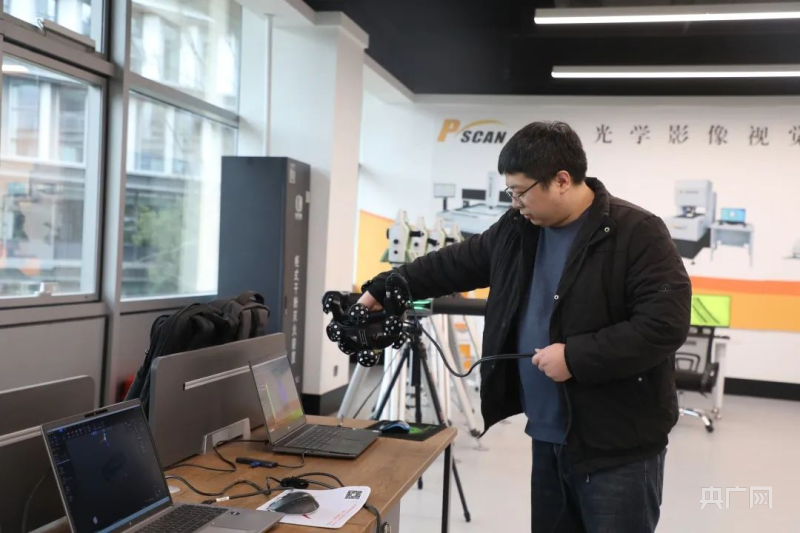 工作人员现场对手持3D扫描仪进行了现场演示,只见他手持扫描仪对身边物体进行了多维度动态扫描,一旁的电脑立马显示出被扫描物体的3D数字图像,实时传输、即时可显,图像智能生成。